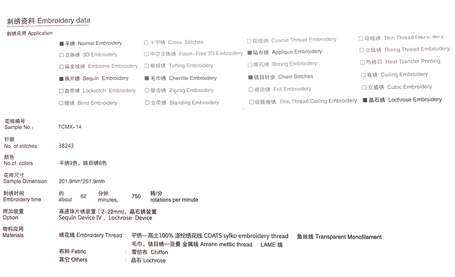 平繡、鏈目繡、毛巾繡、珠片繡、貼布繡及晶石繡,真正做到六合的刺繡效果。 平繡機(jī)頭上9色及特種繡6色,整幅設(shè)計(jì)運(yùn)用了15種顏色并附加奢華的晶石,用機(jī)器刺繡代替?zhèn)鹘y(tǒng)的手縫石工藝,大大提高了生產(chǎn)效率,提升了產(chǎn)品的附加值。